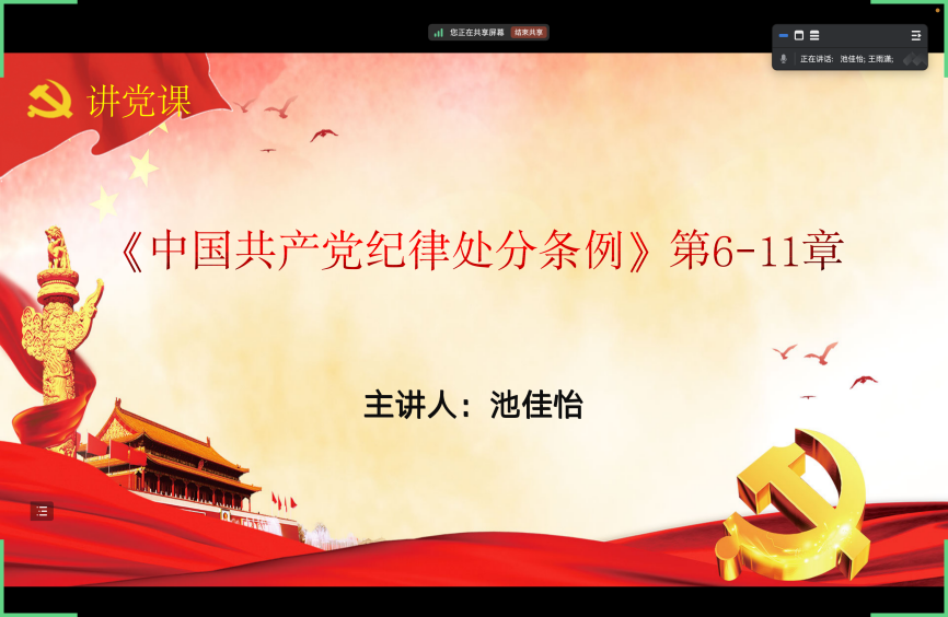 池佳怡同志领学《中国共产党纪律处分条例》,李聪慧同志领学《习近平:开创我国高质量发展新局面》。随后,与会党员分享心得。周鸿同志指出,作为马院学子,我们要深刻认识纪律建设的重要性,把纪律建设融入到自身生活与学习当中,争做一名学纪、知纪、明纪、守纪的好学生、好干部。付靖国同志表示,在前进道路上,我们要牢记使命担当,以青春之力谱写新时代中国特色社会主义更加绚丽的华章。