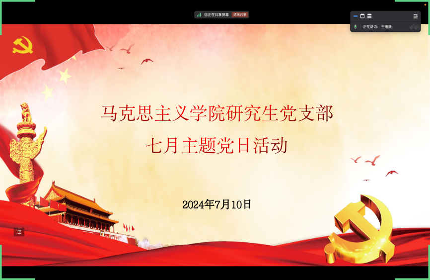 7月10日下午,太阳成tyc7111cc研究生党支部在线上召开7月主题党日活动。本次主题党日活动由研究生党支部书记王雨潇同志主持,支部全体党员参会。