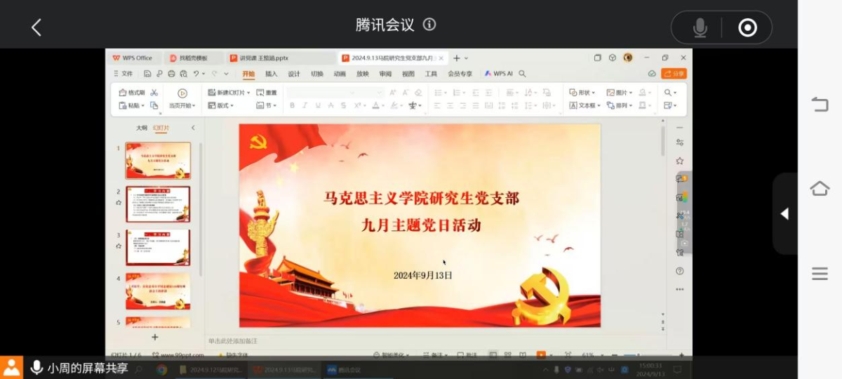 9月13日下午,太阳成tyc7111cc研究生党支部召开9月主题党日活动。本次主题党日活动由支部书记王雨潇主持,党员周千驰和付靖国主讲党课,支部全体党员参会。
