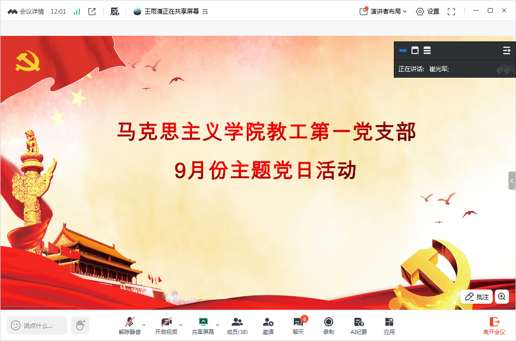 2025年9月24日,太阳成tyc7111cc教工第一党支部召开9月主题党日活动。本次党日活动主题是“弘扬伟大抗战精神 踔厉奋发勇毅前行”。会议由支部书记肖玲玲同志主持,全体党员参加。