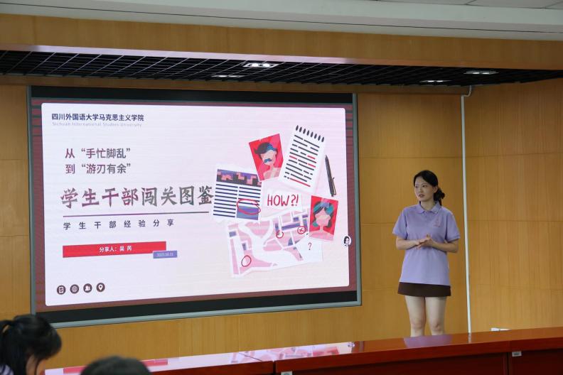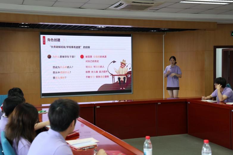 吴芮学姐以“手忙脚乱”到“游刃有余”学生干部闯关图鉴为题,以游戏化闯关为主线,设置角色创建、必备技能、闯关策略、成长升级四大关卡,覆盖通知发布、文件解读、任务分工、补位协作、活动复盘等高频场景。吴芮学姐结合鲜活案例,示范关键信息标注法、24小时制时间表述、补位触发信号等实操工具,引导学生干部们真实体验从信息迷雾到条理清晰的转场。