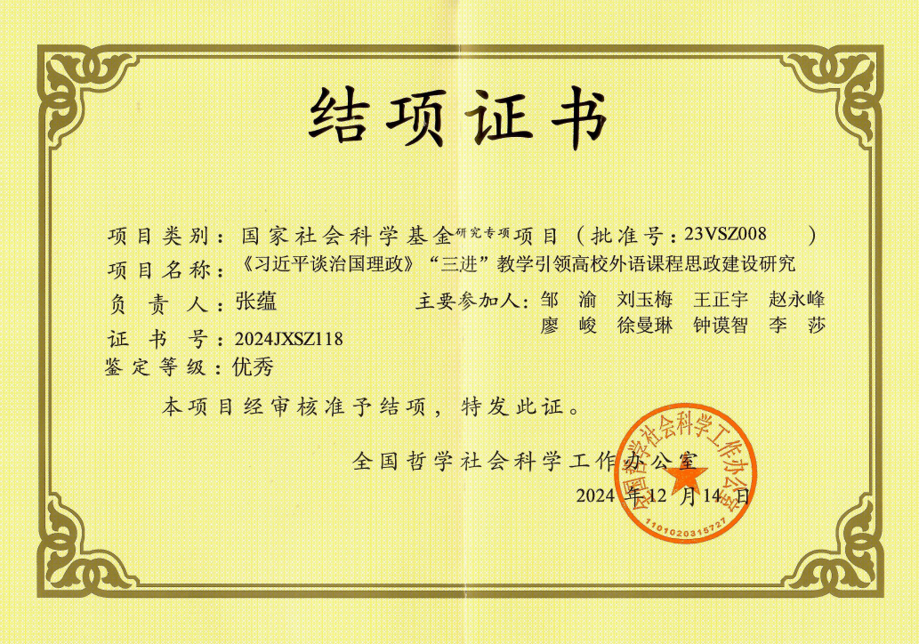 近日,全国哲学社会科学工作办公室公布了本次结项名单,我院张蕴教授主持的“《习近平谈治国理政》‘三进’教学引领高校外语课程思政建设研究”项目,以优秀等级结题。