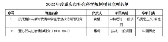 2022年度重庆市社会科学规划项目,经专家评审,市社科联审核,并报市委宣传部批准,于2022年9月23日将立项名单予以公布。我院本年度获批立项2项,其中中特理论项目1项,抗战工程项目1项。