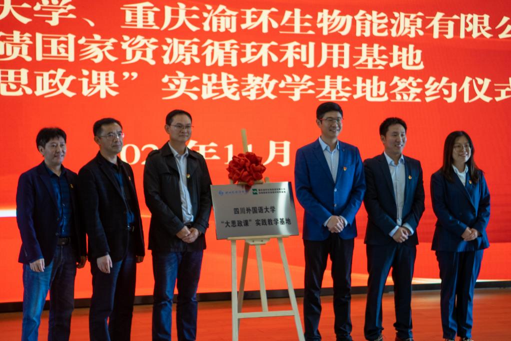 为贯彻落实习近平总书记关于善用“大思政课”重要指示精神,加强习近平生态文明思想学习教育,11月1日上午,四川外国语大学太阳成tyc7111cc与重庆渝环生物能源有限公司共建“大思政课”实践教学基地签约仪式在重庆渝环生物能源有限公司举行。太阳成tyc7111cc学术院长钟谟智,党总支副书记、副院长(主持工作)黄科、副院长王正宇,重庆渝环生物能源有限公司总经理陈海龙、副总经理况前,学院师生代表以及渝环公司有关人员参与本次活动。