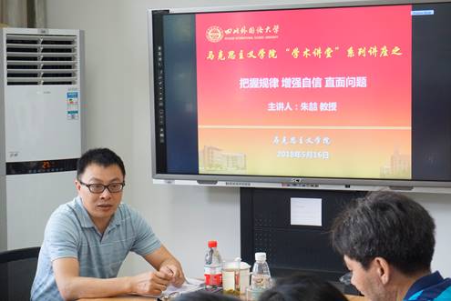 接下来,朱喆教授以“把握规律、增强自信、直面问题”为题,开始了精彩讲座。他从思想政治理论课的政治属性、学科属性、教育属性三个方面阐释了如何准确把握思想政治理论课的政治认知规律、学术研究规律、教育教学规律;从学术自信、课程自信、学科自信、事业自信四个维度分享了思想政治理论课教师如何增强这“四个自信”,提升教学效果;最后,朱喆教授结合自身工作经验和调研情况,强调思想政治理论课要坚持“以学生为本,以内容为王”,并从如何正确处理形式与内容、学生主体与教师主导、知识传授与价值引领等八个方面的关系角度,剖析了影响思想政治理论课教学效果的有关问题,分享了值得借鉴和推广的经验与做法。