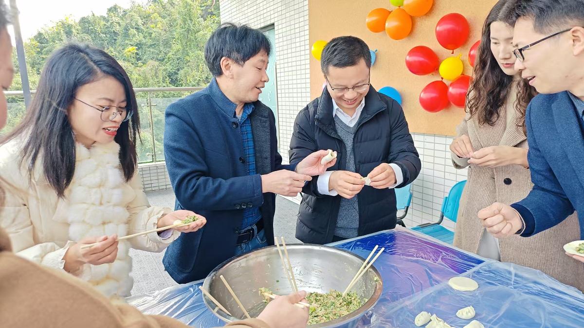 活动当天,天气晴朗,氛围愉悦。上午11点,齐心包饺子拉开了活动的序幕。大家纷纷洗手挽袖,杀水、调馅、包饺子,欢声笑语之中,一个个像金元宝一样的饺子很快成型。当热腾腾的饺子煮好端出,老师们不禁欢呼。品尝着自己动手的成果,感受着劳动带来的快乐,大家直呼“开心”。老师们还邀请现场的学生和学生记者们一起品尝。