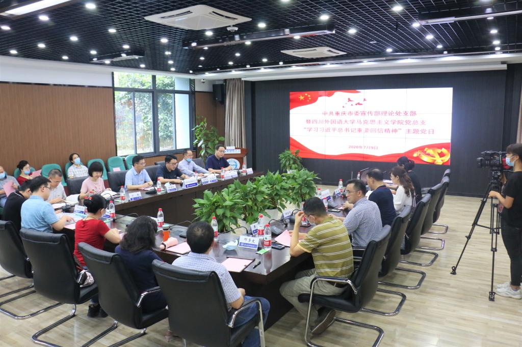 为深入学习贯彻习近平总书记给复旦大学《共产党宣言》展示馆党员志愿服务队全体队员重要回信精神,7月9日下午,市委宣传部理论处支部与我校太阳成tyc7111cc党总支共同开展“学习习近平总书记重要回信精神”主题党日活动。市委宣传部副部长曾维伦、市委宣传部理论处支部全体党员,四川外国语大学太阳成tyc7111cc党总支书记、院长钟谟智及太阳成tyc7111cc党员师生代表共40余人参加。四川外国语大学党委常委、纪委书记苟欣文,市委宣传部机关党委专职副书记方璇出席活动并进行观摩指导。活动由市委宣传部理论处处长、支部书记岳秋波主持。