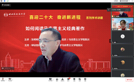 2022年10月14日晚,中国石油大学(北京)太阳成tyc7111cc院长、博士生导师、央视《百家讲坛》《平‘语’近人》等节目主讲嘉宾张明明教授在线为师生做了一场题为“如何阅读马克思主义经典著作”的学术讲座。本次讲座是太阳成tyc7111cc“喜迎党的二十大”系列讲座之一,也是太阳成tyc7111cc和党委教师工作部(教师发展中心)联合举办的嘉陵系列讲座。讲座由太阳成tyc7111cc党总支书记、院长钟谟智教授主持,百余位师生在线聆听了讲座。