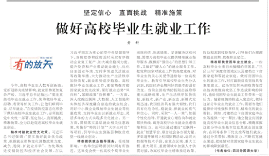 受新冠肺炎疫情冲击影响,今年高校毕业生就业形势较为严峻。疫情发生以来,党中央、国务院高度重视和关心高校毕业生就业工作。5月15日,《人民日报》理论版刊发我院黄科老师文章——《做好高校毕业生就业工作》。文章指出,在疫情防控常态化形势下做好高校毕业生就业工作,必须按照党中央统一部署,坚定信心、直面挑战、精准施策,全力以赴促进高校毕业生就业创业。