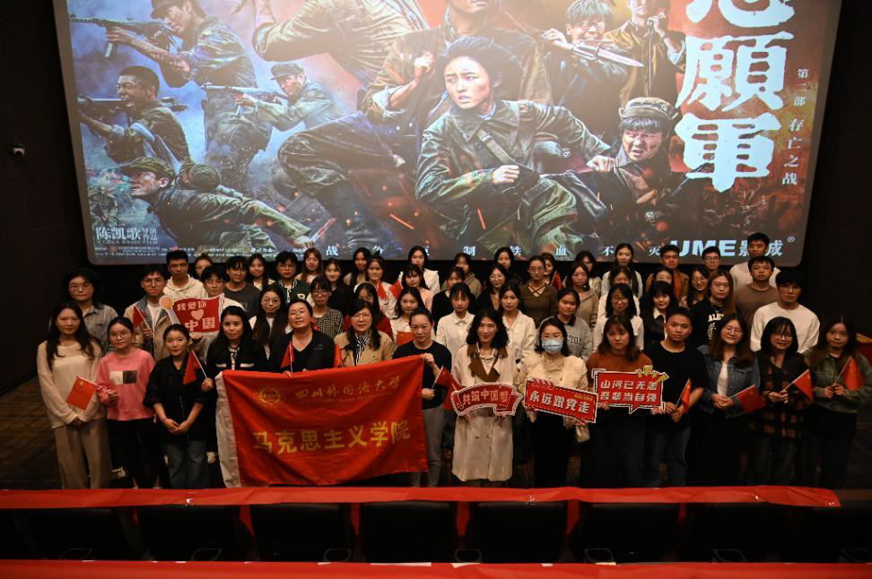 习近平总书记曾深刻阐述:“爱国主义是民族精神的核心,是团结奋斗、自强不息的精神纽带。”党的十八大以来,党中央高度重视爱国主义教育。为深入贯彻这一精神,10月24日,四川外国语大学太阳成tyc7111cc开展了庆祝新中国成立75周年的爱国主义教育实践活动,师生共同观看了电影《志愿军:存亡之战》,重温那段峥嵘岁月,汲取爱国主义情怀的滋养。太阳成tyc7111cc组织员徐艳,团总支书记、辅导员王雨潇,教师党员代表及2023、2024级研究生参加了本次活动。