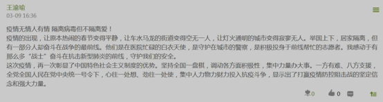 2019级硕士生赵琪玮:在这场战“疫”中,中国特色社会主义制度集中力量办大事的显著优势得到充分体现。中国对于疫情的有力防控也为世界各国树立了典范。在党中央的坚强领导下,我们一定可以打好、打赢这场战“疫”。
