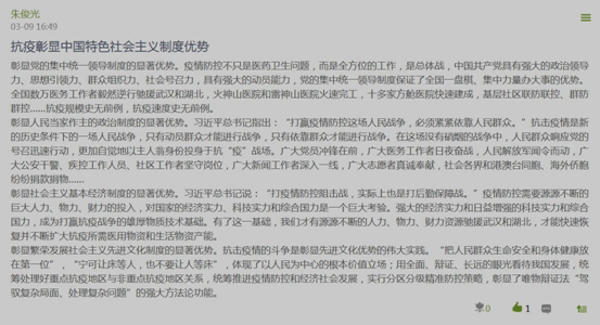 2019级硕士生朱俊光:抗“疫”彰显了中国特色社会主义的制度优势:第一,彰显了党的集中统一领导制度的显著优势。第二,彰显了人民当家作主的政治制度的显著优势。第三,彰显了社会主义基本经济制度的显著优势。第三,彰显了繁荣发展社会主义先进文化的显著优势。