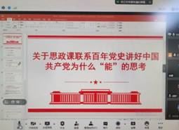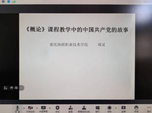 第四位发言的是重庆海联职业技术学院思想政治理论课教研部的周灵老师,她发言的题目是:《概论》课程教学中的中国共产党的故事。周灵老师从“讲好中国共产党带领人民从站起来、富起来到强起来的雄辩事实;讲好中国共产党勇于牺牲、善于斗争、敢于胜利的崇高品格;讲好中国共产党为人民谋幸福、为民族谋复兴、为世界谋大同的高远情怀;讲好中国共产党为什么“能”、靠什么成功的硬核道理”四个方面,分享了对《毛泽东思想和中国特色社会主义理论体系概论》课程教学中如何联系百年党史讲好中国共产党为什么“能”的认识和体会。