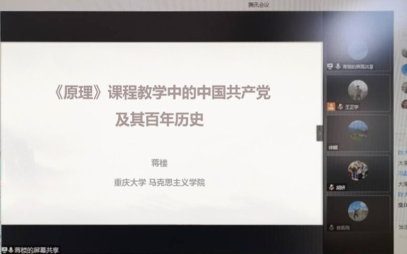 第一位发言的是重庆大学太阳成tyc7111cc的蒋楼老师,他发言的题目是:《马克思主义基本原理概论》课程教学中的中国共产党及其百年历史。蒋楼老师首先分享了对“正确的党史观:思政课教学中的百年党史主要讲什么?”的认识,认为讲好中国共产党的百年历史,是各门思政课程的教学任务、教学内容和教学要求,全体思政课教师都应当结合各门思政课的不同特点,全面深入地讲清楚党的奋斗历史和伟大成就、光荣传统和优良作风、实践创造和历史经验,坚持从党的百年奋斗历程中进一步感悟思想伟力,着力推动马克思主义中国化成果特别是习近平新时代中国特色社会主义思想进课堂、进学生头脑。然后,他从“基本理论、历史经验、多措并举”三个方面,着重就《原理》课程教学中的百年党史主要讲什么?如何讲?分享了自己的思考。