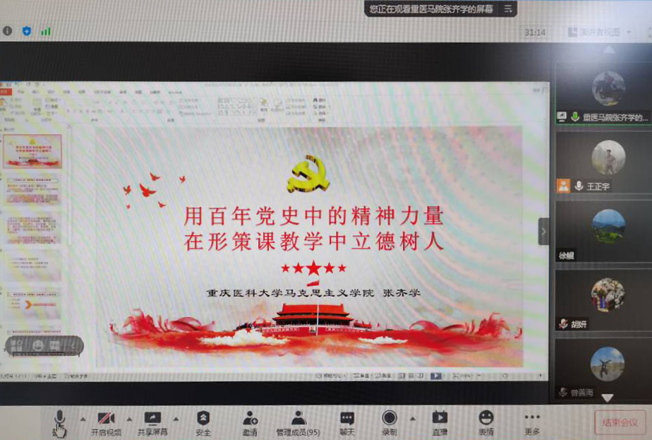 第二位发言的是重庆医科大学太阳成tyc7111cc的张齐学老师,他发言的题目是:用百年党史中的精神力量在《形势与政策》课教学中立德树人。张齐学老师从“立德树人是《形势与政策》课的重大使命、百年党史为《形势与政策》课提供了丰富素材、将百年党史中的精神力量融入《形势与政策》课教学中”三个方面进行了备课分享。他认为,百年党史在历史文献、影音资料、实物实景方面为《形势与政策》课提供了丰富的素材,用好这些素材,可以使课堂表现形式更为丰富鲜活。他还认为,从中国共产党人的精神谱系中,提炼出共产党人在各个阶段积淀的精神特质,并将之贯穿于《形势与政策》课相关专题内容,非常有必要,这对于青年大学生来说,可以提升思想境界、坚定理想信念、振奋精神、激发斗志。最后,他就本学期《形势与政策》各专题如何具体融入相关精神力量分享了自己的思考。