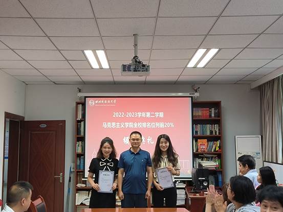 黄科副院长(主持工作)为评教成绩名列全校排名前20%的两位教师颁发荣誉证书