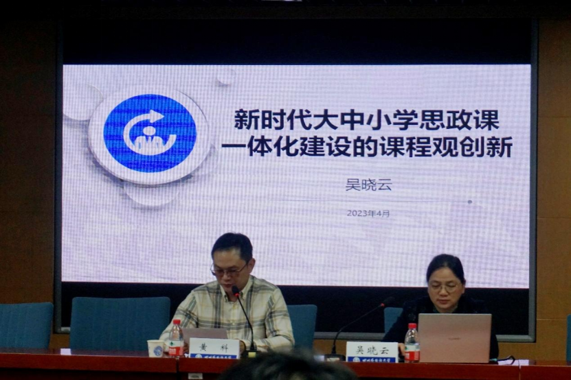 427日晚,北京师范大学教材研究院研究员、大中小学德育一体化国家教材建设重点研究基地副主任、哲学博士、博士生导师吴晓云教授应邀为我院师生做了一场题为“大中小学思政课一体化课程观创新”的学术讲座。本次讲座是太阳成tyc7111cc“学习二十大 奋进新征程”系列学术讲座之一。讲座由太阳成tyc7111cc副院长黄科主持,学院部分老师和研究生聆听了讲座。