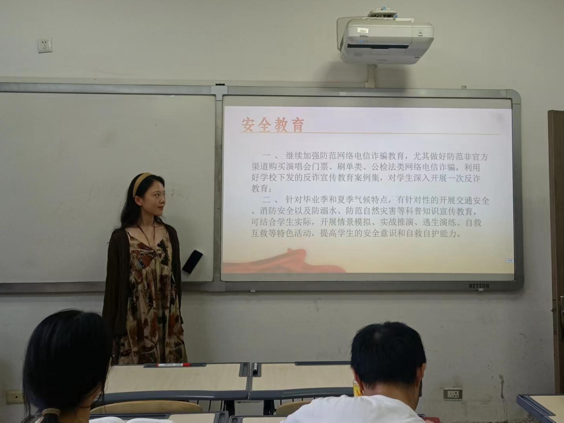 其次,在安全教育方面,班长吴芮着重强调了对网络电信诈骗的防范,针对当前社会热点和同学们关心的问题,进行了讲解并分享了识别诈骗、防范诈骗的实用方法。例如,针对非官方渠道购买演唱会门票、刷单类、公检法类网络电信诈骗,班会通过视频、图片等多种形式,向同学们展示了诈骗分子的狡猾手段和危害后果。结合毕业季和夏季气候特点,本次主题教育有针对性地开展了交通安全、消防安全、防溺水以及防范自然灾害等科普知识宣传教育。通过模拟演练、互动问答等形式,让同学们更加直观地了解安全知识,提高同学们的安全防范意识和自救自护能力。