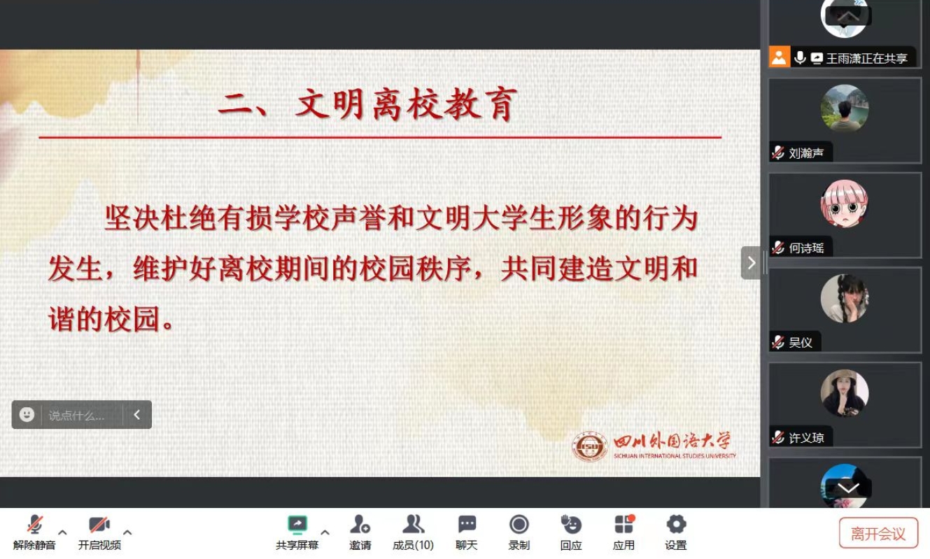 6月27日,王雨潇老师对2021级毕业学生进行了文明离校主题教育。她指出毕业生离校不仅是个人的告别仪式,更是对母校的尊重和感恩。她呼吁同学们在离校前,要做到爱护校园环境,保持宿舍整洁,清理干净生活垃圾,确保公共设施的完好无损,及时归还宿舍钥匙。同时,还分享了一些文明离校的具体做法,遵循学校规章制度、参与校园清洁活动、捐赠闲置物品等,以实际行动践行文明离校的理念。