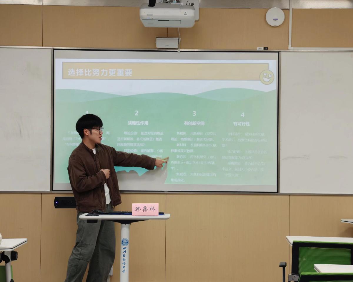 为破解研究生在科研起步阶段普遍存在的选题方向模糊、价值判断不清、操作路径不明等关键难题,我院于11月14日在歌乐楼B604成功举办主题为“马克思主义理论专业学术论文选题的突围路径”的朋辈沙龙活动。本次活动邀请2024级马理论1班研究生韩鑫林担任主讲,学院全体研究生参加。