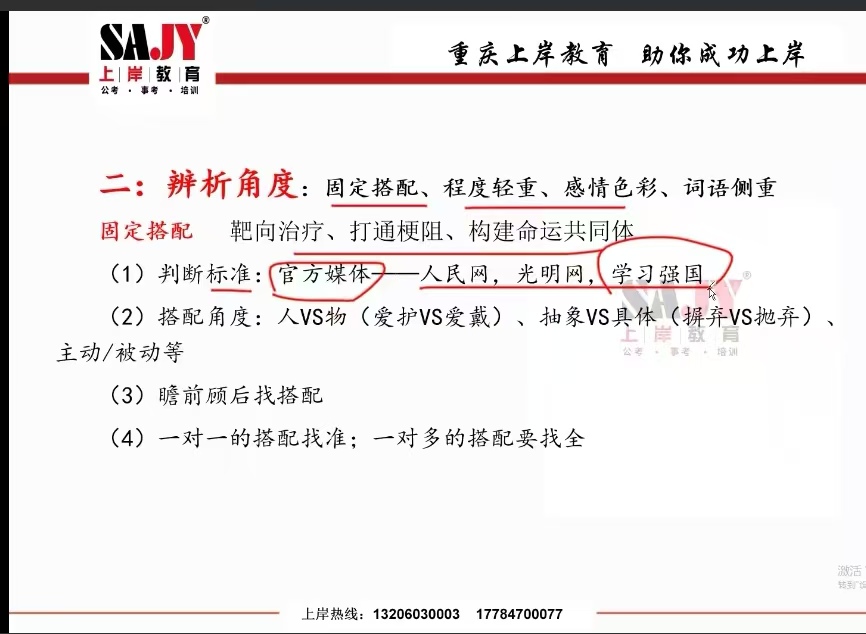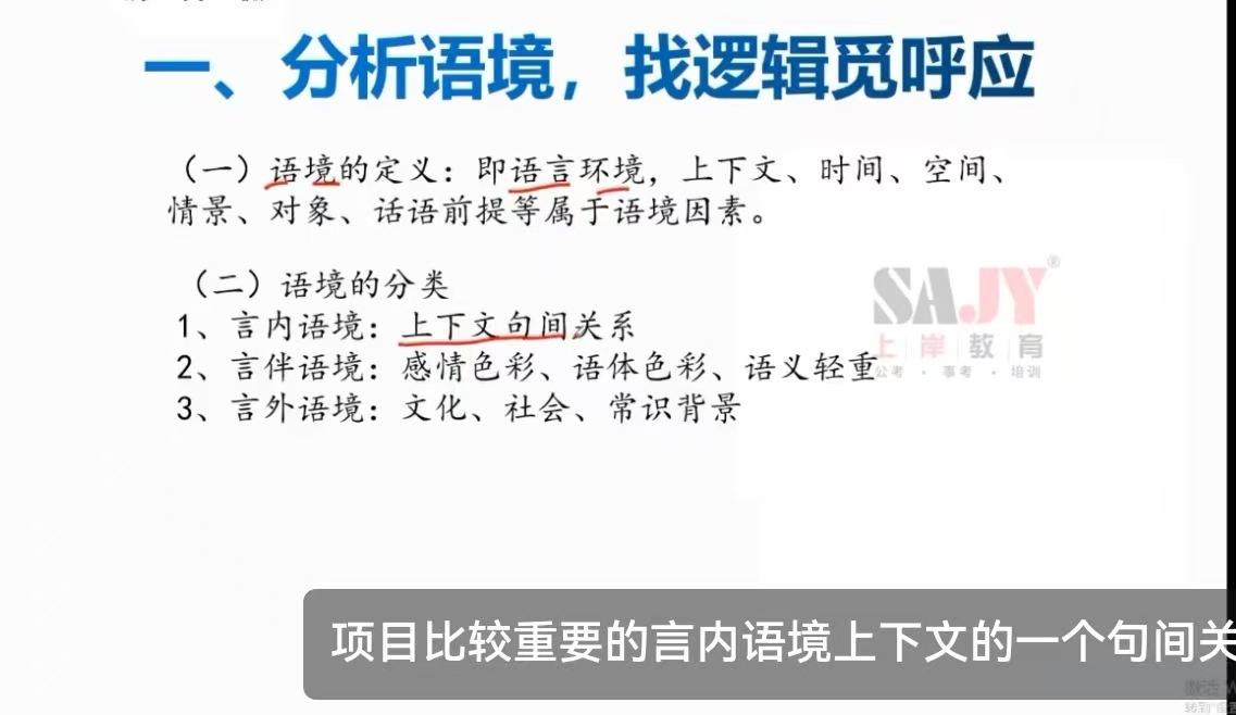 课程伊始,曹老师主要围绕逻辑填空题的解题技巧,系统讲解了“语境分析”与“词语辨析”等核心知识点。其中语境分为言内语境、言伴语境和言外语境;词语辨析的方法包括语素联想法和遣词造句法。随后并通过例题展示,为同学们拆解了典型例题的解题思路。