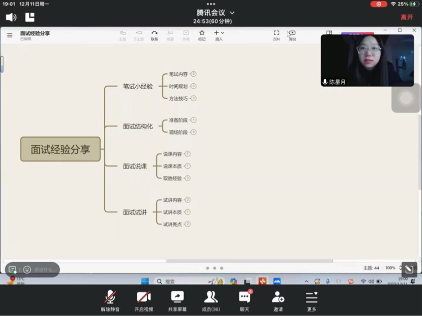 本次的经验分享,她主要提到了四个方面:笔试小经验、面试结构化、面试说课、面试试讲四个部分。对应各部分的内容,她使用了思维导图的形式进行了系统化的讲解。在四个部分中,她还特别强调了面试说课和面试试讲的部分。针对面试说课中的说课内容、说课本质、取胜经验三个部分进行了详细的讲解。对于面试试讲部分她也补充了试讲内容、试讲本质、试讲亮点等内容。