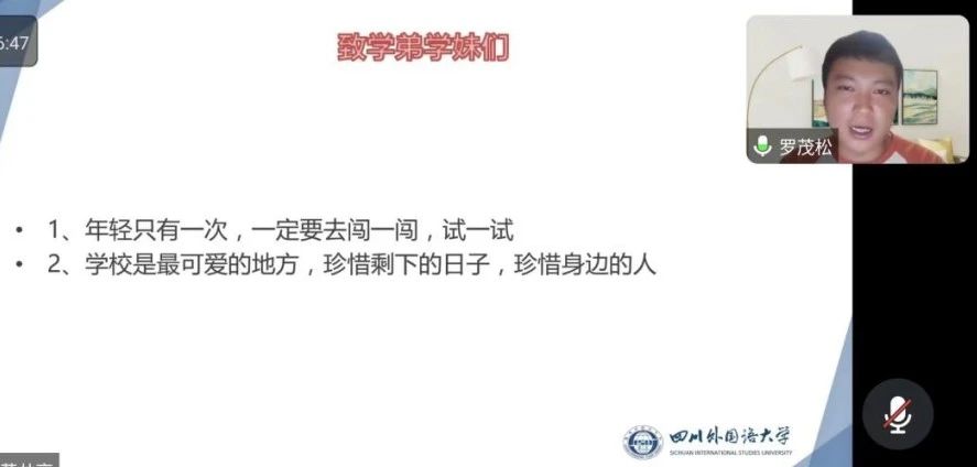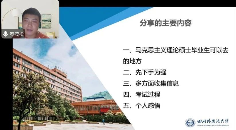 9月10日晚,我院开展线上就业经验分享会。2023届优秀毕业生罗茂松从就业方向、就业准备、招聘信息、考试经验以及自身感悟五个方面进行了经验分享。