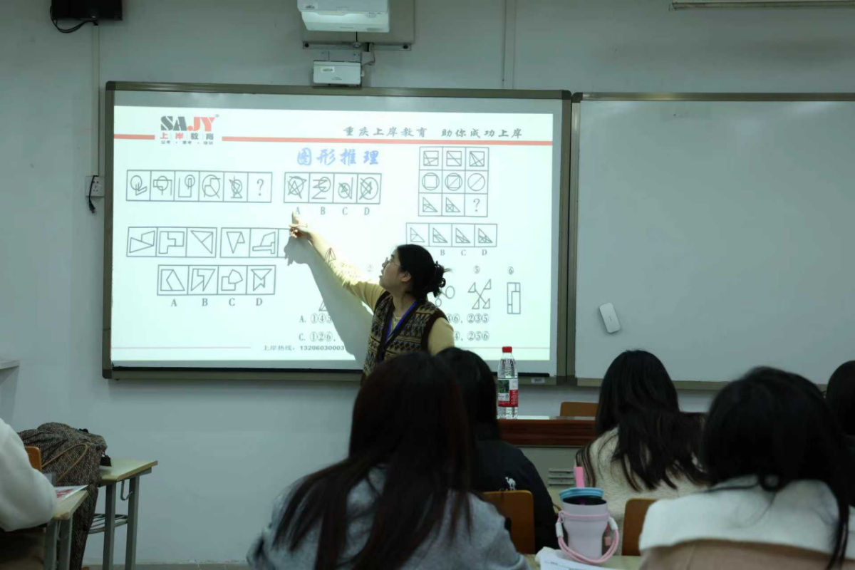 课堂上,授课老师结合近年国考、省考命题趋势,将看似杂乱的图形规律归纳为“定性分析、定量分析、位置分析”三大考法,并进一步提炼出“移动、叠加、部分数、递推”等七大高频考点。通过“例题拆解—规律建模—即时演练”的三步教学法,老师带领同学们快速勾画、标注关键信息,一起拆解图形规律。崔书记也随机加入小组讨论,与同学们一起推敲图形的旋转角度与元素增减关系,课堂氛围十分热烈。课后,同学们都表示,老师的讲解让抽象的规律瞬间具象化,大大提升了做题信心。崔书记在总结讲话中鼓励大家:“求职路上没有白走的路,每一次动手积累、每一次思维突破,都会在未来的考场上发光。”