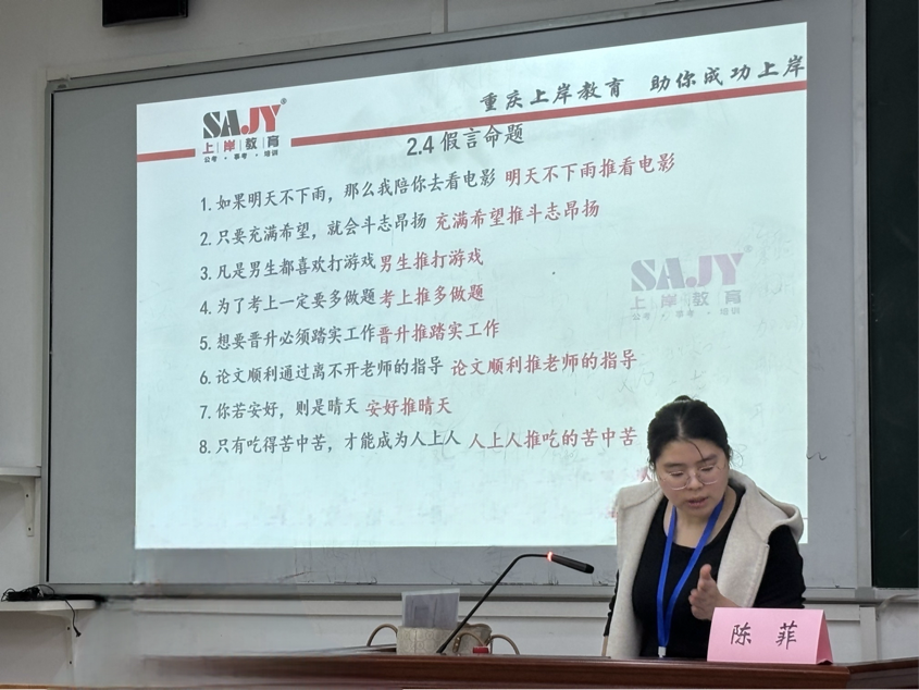 课后,同学们纷纷表示,“以前总觉得逻辑判断绕,听完老师的‘题干关键词定位法’,终于能抓住题目的‘题眼’了!”课程不仅梳理了题型框架,更提供了可直接套用的解题技巧。通过这样的教学方法,学生们提高了逻辑思维能力的同时还增强了应对各类逻辑题目的信心。陈菲老师强调,掌握方法比死记硬背更为重要,这将帮助学生在未来的学习和生活中更加游刃有余。